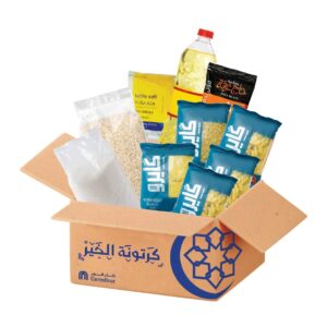 • وضع مجموعة من السلع الغذائية مثل الزيت واللحم والأرز والمعكرونة وعلب من الفول، في علبة من الكرتون.